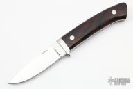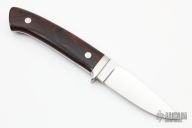 This knife from George Herron features a mirror polished blade, .171" Blade Stock .926" Blade Depth. A tapered tang construction with a desert ironwood burl scales with red liners and a stainless steel guard. Comes with a brown leather sheath. #2750 on tang. Excellent condition.