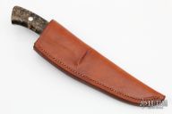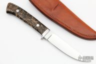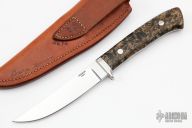 This Model 8 Hunter by the late George Herron features a mirror polished blade, .182" blade stock, .867" blade depth, full tapered tang construction. The handle has a stainless steel guard, burl wood scales with black liners. Numbered 2696 on tang and brown leather sheath. Excellent condition.  Dated 2000