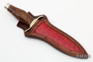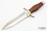 This Dagger by Eugene and Sons features a mirror polished double edged blade with .234" blade stock and 1.449" blade depth, hidden tang construction. The handle has a brass guard, thuya burl wood grip, nickel silver butt, nickel silver/red/black/blue/brass. Comes with a brown leather sheath with red snake skin inlay. Has a few light scratches and some light patina, otherwise good condition.