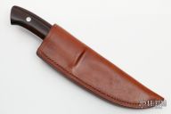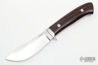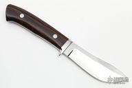 This Semi-Skinner by the late George Herron features a mirror polished upswept blade, .178" blade stock, 1.210" blade depth, full tapered tang construction. The handle has a stainless steel guard, red liners, and desert ironwood scales. Numbered 2179 on bottom of tang. Includes a brown leather sheath. Excellent condition.