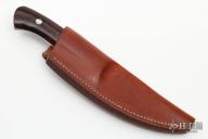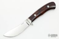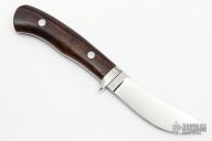 This Semi-Skinner by the late George Herron features a mirror polished upswept blade, .110" blade stock, .925" blade depth, full tapered tang construction. The handle has a stainless steel guard and desert ironwood burl scales with black liners. Numbered 2216 on bottom of tang and sheath. Comes with original brown leather sheath. Excellent condition.