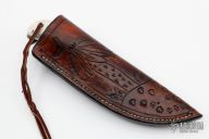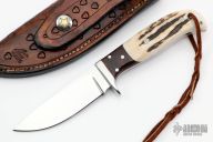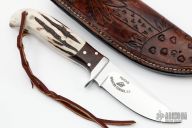 This knife by Jerry Hucks features a mirror polished blade with .126" blade stock and 1.119" blade depth, full tang construction. The handle has a stainless steel guard, desert ironwood burl and stag scales. Lanyard tube in pommel. Includes a hand tooled brown leather sheath with belt loop that has a snap. Excellent condition.