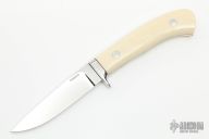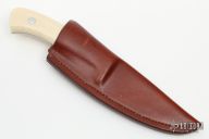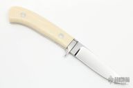 This Little Bigbie #1310 by George Herron has a mirror polished blade with .112" blade stock, .815" blade depth, full tampered tang construction. The handle has a stainless steel guard and synthetic ivory scales with red liners. Comes with original brown leather sheath. Excellent condition.
