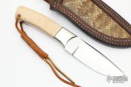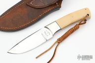 This Hunter by ML Snare features a mirror polished blade with .183" blade stock and 1.304" blade depth, full tang construction. The handle has nickel silver bolsters, ivory paper micarta scales with black liners. Comes with a brown leather sheath with snakeskin inlay. Excellent condition.