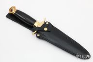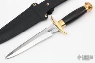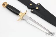 This dagger by John Nelson Cooper features a satin finished double edged blade, .214" blade stock and 1.26" blade depth, hidden tang construction. The handle has a brass guard and butt, black paper and canvas micarta grip. Has some light scratches. Excellent condition for the age.