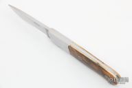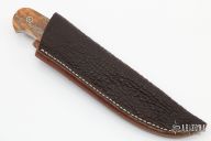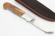 This fixed blade from Pete Forthofer features a drop point hand rub satin finished blade with .158" blade stock and .805" blade depth, full tapered tang construction. The handle has stainless steel bolsters, mammoth ivory scales with mosaic pins. Includes leather sheath with belt loop. Excellent condition.