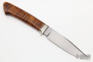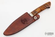 This hunter from Jim Crowell features a forged clip point satin finish blade, .185" Blade Stock. 1.066" Blade Depth. The handle has a nickel silver guard with black and nickel silver spacers and a curly maple grip over hidden tang construction. Includes a brown leather sheath with belt clip by Rowe's Leather. Has some light pitting, otherwise excellent condition.