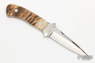 This Fighter from Mr. Pease features a hand rub satin finished blade with a false top edge, .161" blade stock and .883" blade depth, full tapered tang construction. The handle has stainless steel bolsters, sheep horn scales with stainless steel pins. Comes with a brown leather sheath with boot clip. Excellent condition. "R2m9" on blade.
