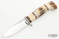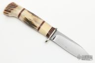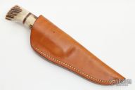 This Hunter by Morseth Knives features a satin finished laminated blade with .173" blade stock and .976" blade depth, hidden tang construction. The handle has a nickel silver guard, stag grip with red/white/black spacer pattern. Comes with a brown leather sheath. Has somlight scratches and patina, otherwise excellent condition.