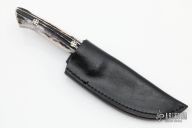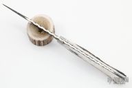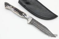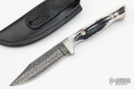 This knife by James Largent features a multi-bar Damascus blade with fileworked blade spine, .153" blade stock and 1.023" blade depth, full tapered tang construction. The handle has satin finished dovetailed stainless steel bolsters, stag scales and mosaic pins, the tang is fully fileworked. Comes with a black leather sheath. Has some light scratches and oxidation, otherwise good condition.