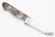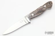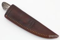This hunter by Ricky Rankin features a mirror polished blade with .143" blade stock and .971" blade depth, full tapered tang construction. The handle has a stainless steel guard with giraffe bone scales and black liners. Comes with a brown leather sheath. Excellent condition.
