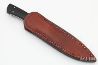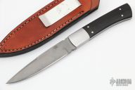 This knife by Bill Reddiex features a bead blasted blade with false top edge, .129" blade stock and .809" blade depth, full tapered tang construction. The handle has dovetailed stainless steel bolsters and black linen micarta scales. Comes with a brown leather sheath with boot clip. Has some light scuffs/scratches, otherwise excellent condition.