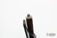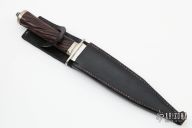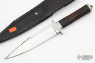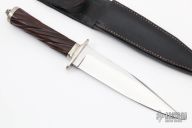 This knife by Donald E. Weiler has a mirror polished spear point blade with a false top edge, .245" blade stock and 1.423" blade depth, hidden tang construction. The handle has a nickel silver guard and butt, spiral fluted desert ironwood grip with a fluted nickel silver sapcer. Comes with a black leather sheath. Has a few light scratches, otherwise excellent condition.