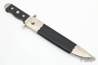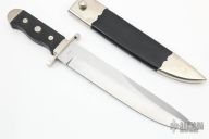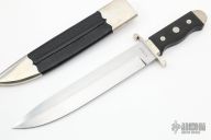 This bowie by Alex Daniels features a hand rub satin finished blade with a false top edge, .310" blade stock and 1.737" blade depth, hidden tang construction. The handle has a nickel silver guard, nickel silver bolsters, front and rear, checkered black wood grip. Comes with a black leather and nickel silver scabbard. Has a few light scratches and a little patina, otherwise excellent condition.