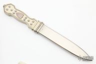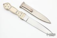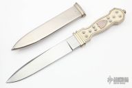 This San Francisco Dirk by Chuck Roberts features a hand rub satin finished blade with false top edge, .240" blade stock and 1.196" blade depth, hidden tang construction. The handle has a nickel silver guard and frame with synthetic ivory inlays with silver escutcheon. Comes with a matching nickel silver scabbard. Has some light scratches, otherwise excellent condition. Comes with a zippered case.