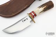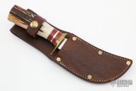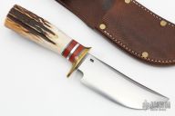 This skinner by Jim Behring of Treeman Knives features a satin finished convex ground blade, .231" blade stock and 1.533" blade depth, hidden tang construction. The handle has a brass guard, stag grip with Black/aluminum/Red spacer pattern. Comes with a hand tooled MOSHER brown leather sheath. Excellent condition. At one point it had a compass in the butt, but it has fallen out.