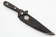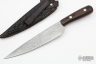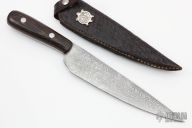 This knife (please let us know if you know who made this) features a Damascus blade with .175" blade stock and 1.446" blade depth, full tapered tang construction. The handle has wenge wood scales. Comes with a hand tooled black leather sheath. Has some light scratches and oxidation, otherwise good condition.