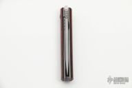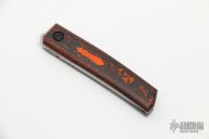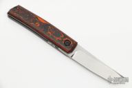 This Mini Tachi by Jared Oeser features a hand rub satin finish tanto style blade with notched front flipper. The handle has Fat Carbon scales over black G-10 liners, multi-color G-10 backspacer, orange G-10 shield.  Includes leather slip sheath, box and papers, dated 6-17-21.  Nice detent, lock up and blade seating. Excellent Condition.
