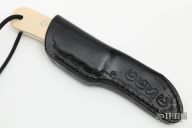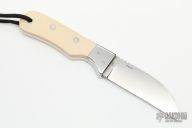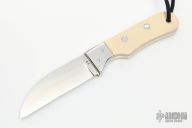 This sheepsfoot by Mick features a satin finished blade with notched thumbrest, .178" blade stock and 1.141" blade depth, full tang construction. The handle has stainless steel dovetailed bolsters and ivory paper micarta scales. Comes with a black leather sheath and a zippered case. Has some light scratches, otherwise excellent condition.
