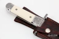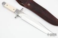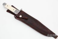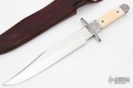 This Bowie by Mick Langley features a mirror polished blade with a false top edge, .176" blade stock and 1.568" blade depth, full tang construction. The handle has an engraved stainless steel guard and bolsters, mammoth ivory scales and red liners. Comes with a brown leather sheath with belt loop. Has a few very light scratches, otherwise excellent condition. Comes with a zippered case.