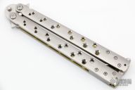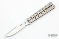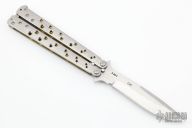 This Balisong by Korth Cutlery features a drop point satin finished blade with false top edge. The handles are orange peel finished titanium with anodized insides, has t-latch. #49 on the blade. Comes with a zipper case. Has some light scuffs and scratches, otherwise great condition.