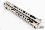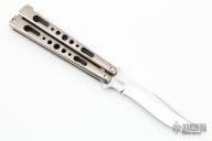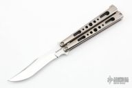 This Balisong by Mauricio Dobruski features a mirror polish finished blade. The handles are a high satin finish full channel construction titanium with a matching T-latch. Comes with zippered case. Marked CB20 on the rear of the blade. Action is a little tight. Has some light scuffs and scratches throughout. Excellent condition otherwise.