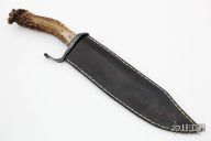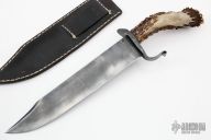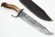 This Bowie by Master Smith Daniel Winkler features a clip point blade with visible temper line, .305" Blade Stock, 1.980" Blade Depth, hidden tang construction. The handle features a gorged steel guard and a crown stag grip with a forged lanyard bail. Includes a black leather sheath. Light patina, otherwise excellent condition. Comes with a zippered case.