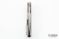 This Pro Line Valve Flipper by Gerry McGinnis features a tumble finished drop point blade with swedge, notched thumbrest and flipper. The handle is comprised of a tumbled, and milled titanium frame over black G-10 backspacer. Matching tip up clip is positioned for right hand carry. Lanyard hole in pommel. Great blade seating, detent and lock up. Includes padded and zippered case. Excellent condition.