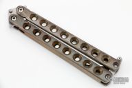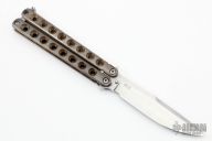 This Balisong by Charles Marlowe features a handrub satin finished drop point blade with false top edge. The handles are full channel heavy orange peel and anodize finish titanium and have a T-latch. Comes with a Velcro belt sheath. Has some light scuffs and scratches throughout, and a little junk in the ricasso - otherwise great condition.