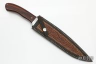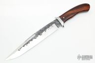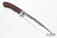 This Slim Bowie by Master Smith Rick Dunkerley features a hand rub satin finished blade with hammer marked flats and false top edge, .208" blade stock and 1.372" blade depth, hidden/mortise tang construction. The handle has a stainless steel guard with engraving/stippling, desert ironwood grip with nickel silver pins. Comes with a hand tooled brown leather sheath with sharkskin overlay. Excellent condition.