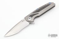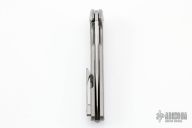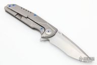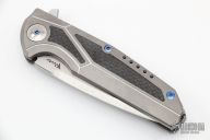 This K-4 by Reate Knives features a recurve tanto blade with notched thumbrest and flipper. The handle has a bead blasted titanium frame with carbon fiber inlays, bead blasted titanium backspacer. Stainless lockface insert. Has some scuffs on the frame, otherwise excellent condition.