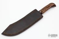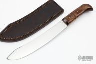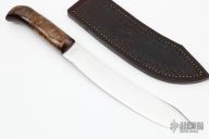 This Carving/Butcher Knife by Master Smith Bill Moran features mirror polished upswept blade with .136" blade stock and 1.426" blade depth, full tang construction. The handle has a beautiful curly maple grip. Comes with a brown leather sheath (not original, but made for this knife, its very nice) and zippered case. Has a little patina and a few light scratches, otherwise excellent condition. Made in Lime Kiln MD.
