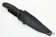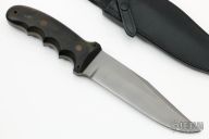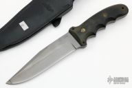 This Grey Ghost features a bead blasted clip point blade with a false top edge, .245" blade stock and 1.570" blade depth, full tang construction. The handle has black linen micarta scales with brass pins and lanyard hole. Nice finger contours for comfort and grip. Comes with a black leather sheath. Has some light scuffs and patina, otherwise excellent condition. Comes with a zippered case.