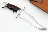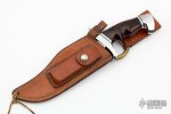 This Bowie/Fighter by Rod Chappel (Davis Knives) features a mirror polished blade with a sharpened top edge, .244" blade stock and 1.877" blade depth, hidden tang construction. The handle has a stainless steel guard and butt, cocobolo grip with black and aluminum spacers. Very nice figuring in the handle, has an amazing grip. Comes with a brown leather sheath. Excellent condition. Knife is dated March 21th 1972. Comes with a zippered case.
