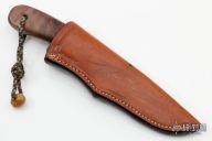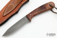 This hunter by Chris Brookshear features a lightly blued and hand rub satin finished blade .104" blade stock and .993" blade depth, full tang construction with curly maple scales. Comes with a brown leather sheath. Excellent condition. Comes with a zippered case.