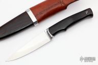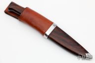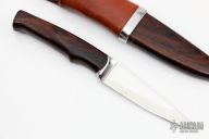 Please let us know if you recognize who made this knife, it has a heart inlaid in silver wire in the handle. This knife features a mirror polished blade with hamon and integral guard, .167" blade stock and .998" blade depth, hidden/mortise tang construction. The handle has a cocobolo grip and a lanyard bail at the butt. Comes with a brown leather and cocobolo sheath. Excellent condition.