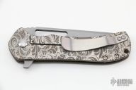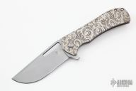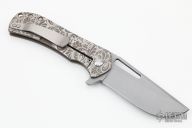 This Recon Flipper by Doc Shiffer features a tumble finished blade with thumbhole, flipper and fileworked thumbrest. The handle has a laser engraved titanium frame with a satin finished titanium tip up clip. Rides on bearings, nice detent, lockup and blade seating. Comes with a COA dated 7-8-22. New from maker.
