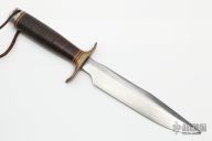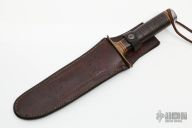 This Model 1-7 from Randall Made Knives features a satin finished clip point blade with sharpened top edge, .229" blade stock and 1.213" blade depth, hidden tang construction. The handle is comprised of a brass guard, red/white/blue spacers, stacked leather handle and duralumin pommel with lanyard hole. Comes with original HH Heiser brown leather sheath. The soldier who carried this knife cut off the stone pouch on the sheath which was a common thing for them to do so it wouldn't snag on things. Comes with a Randall zippered case. Comes with a copy of "Soldier of Fortune" magazine from October 1985, which has an artical about Randall Made Knives and shows an almost identical knife on page 56. The magazine is a treat in itself and a true blast from the past of what was cool over 35 years ago!