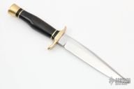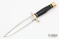 This Fighter features a clip point satin finished blade with a false top edge, .247" blade stock and 1.139" blade depth, hidden tang construction. The handle has a brass guard and butt, black linen micarta grip, black and brass spacers. Has a few light scratches, otherwise excellent condition. Comes with a zippered case.