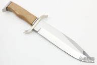 This Bowie by Bob Sky features a mirror finished spear point blade with sharpened top edge, .245" blade stock and 1.990" blade depth, hidden tang construction. The handle has nickel silver S-guard, natural linen micarta grip with nickle silver butt. Comes with a zippered case. Has some light scratches, otherwise excellent condition.