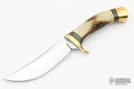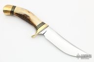 This hunter by Bernard Sparks features a mirror polished upswept blade, .183" blade stock and 1.183" blade depth, hidden tang construction. The handle has a brass guard and butt cap, stag grip with black and brass spacers. This knife feels great in the hand - well balanced and fitting. Excellent condition. Comes with a zippered case.
