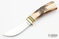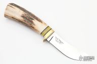 This skinner by WB Wiggins features a mirror polished blade with .112" blade stock and .829" blade depth, hidden tang construction. The handle has a brass guard, stag grip and black/amber spacers. Comes with a zippered case. One shallow crack in stag handle on show side but other than that excellent condition.