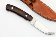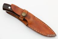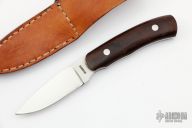 This Hunter by William Gordon Defreest features a satin finished blade, .123" blade stock and .920" blade depth, full tapered tang construction. The handle has wood scales. Comes with a brown leather sheath and a padded zippered case. Has a couple light scratches, otherwise excellent condition.