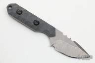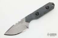 This Mini Camper by Tactical Pterodactyl features a drop point blade with a stonewash finish, notched thumbrest, .131" blade stock and .96" blade depth, full tang construction. The handle has sculpted gray g10 scales. Comes with a kydex sheath. Excellent condition.