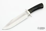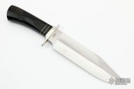 This Bowie by AG Russell was made by Schrade in the USA. It has a satin finished blade with false top edge, .220" blade stock and 1.863" blade depth, hidden tang construction. The handle has a black linen micarta grip with brass spacers and double nickel silver guard. Excellent condition. Comes with a zippered case.
