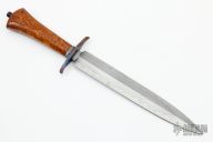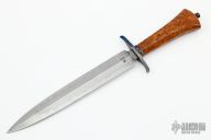 This Dagger by Master Smith Bailey Bradshaw features a Damascus double edged blade with .233" blade stock and 1.215" blade depth, hidden tang construction. The handle has a blued steel guard and a burl wood grip, blued steel tang nut. Has some light scratches and some light oxidation, a little wear on the blued finishes, otherwise excellent condition. Comes with a zippered case.