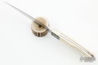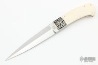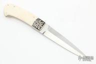 This Dagger by Fred Carter features a double-edged hand rub satin finished blade, full tapered tang construction with .239" blade stock and 1.170" blade depth. The handle has engraved nickel silver dovetailed bolsters, mammoth ivory scales with nickel silver pins. Comes with a zippered case. Excellent condition.