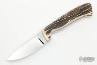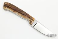 This Hunter from P.F. Beck features a mirror polished drop point blade with .199" blade stock and .981" blade depth, full tapered tang construction. The handle has stag scales with scrimshaw, black liners and full tapered tang construction. Includes zippered case. Excellent condition.