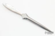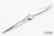 This Dagger by Claude Montjoy features a hand rub satin finished double edged blade with .251" blade stock and .555" blade depth, full tapered tang construction. The handle has mother of pearl scales with red liners and stainless steel pins. Comes with a zippered case. Excellent condition.