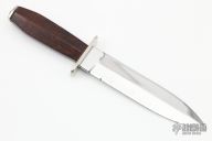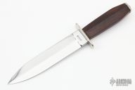 This knife by Donald E. Weiler has a mirror polished double edged blade with .176" blade stock and 1.235" blade depth, hidden tang construction. The handle has a fileworked nickel silver guard and butt with a desert ironwood grip. Has a few light scratches and a couple small oxidation spots, otherwise good condition. Comes with a zippered case.